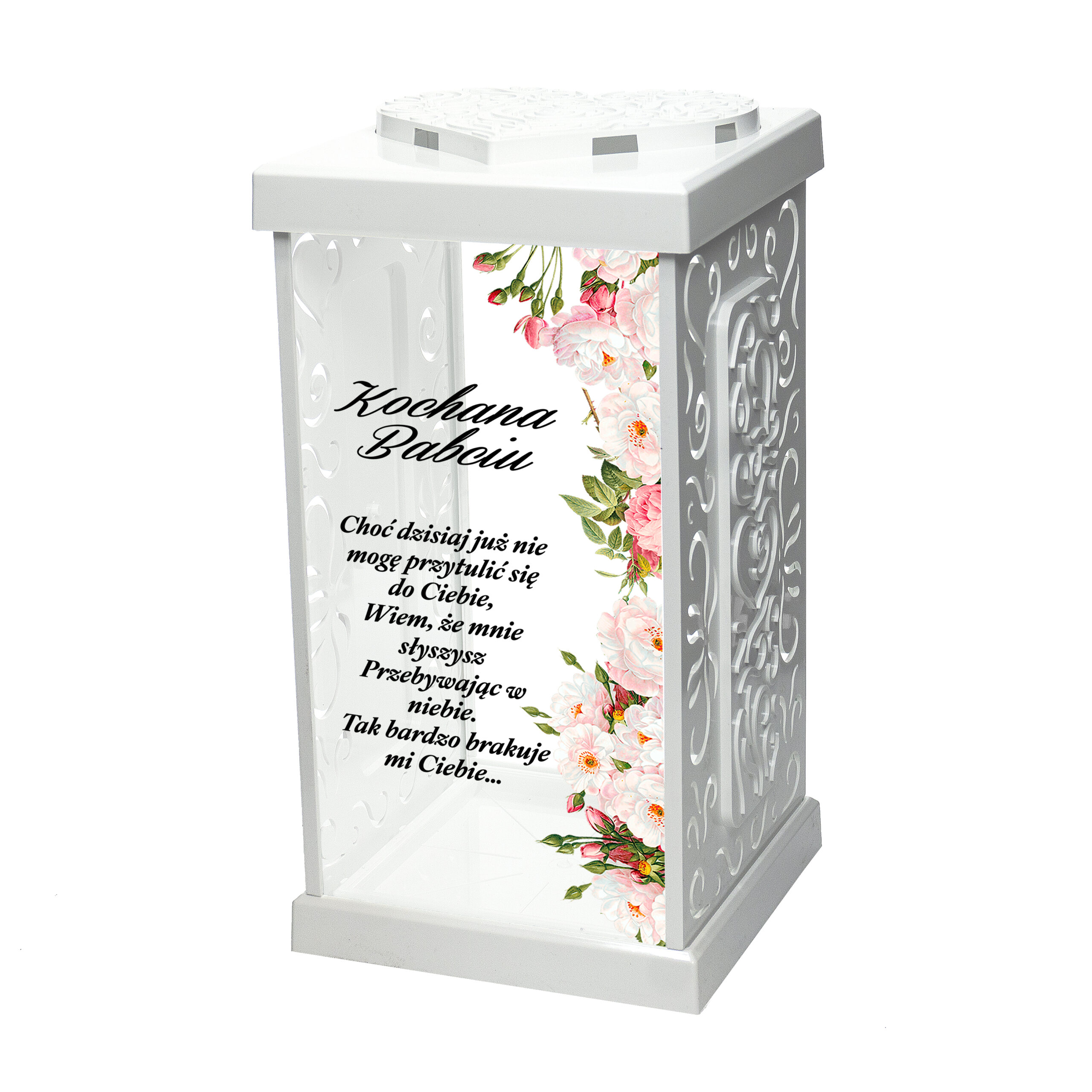 Czarny lub biały znicz personalizowany z kwiatami, z własną dedykacją GRACJA