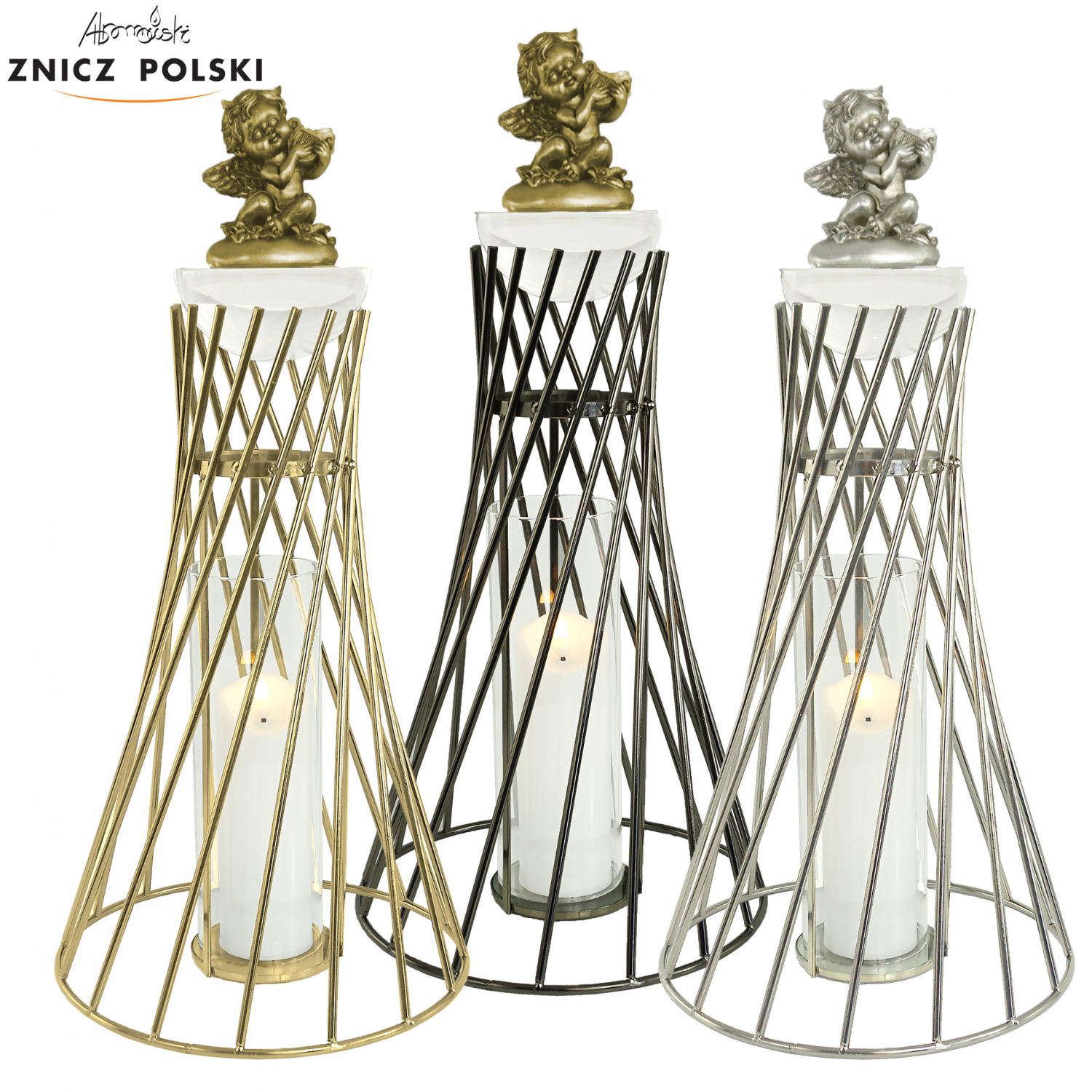Ekskluzywny wysoki srebrny, złoty lub czarny znicz ze stali nierdzewnej z figurką anioła WIEŻA ANIOŁ