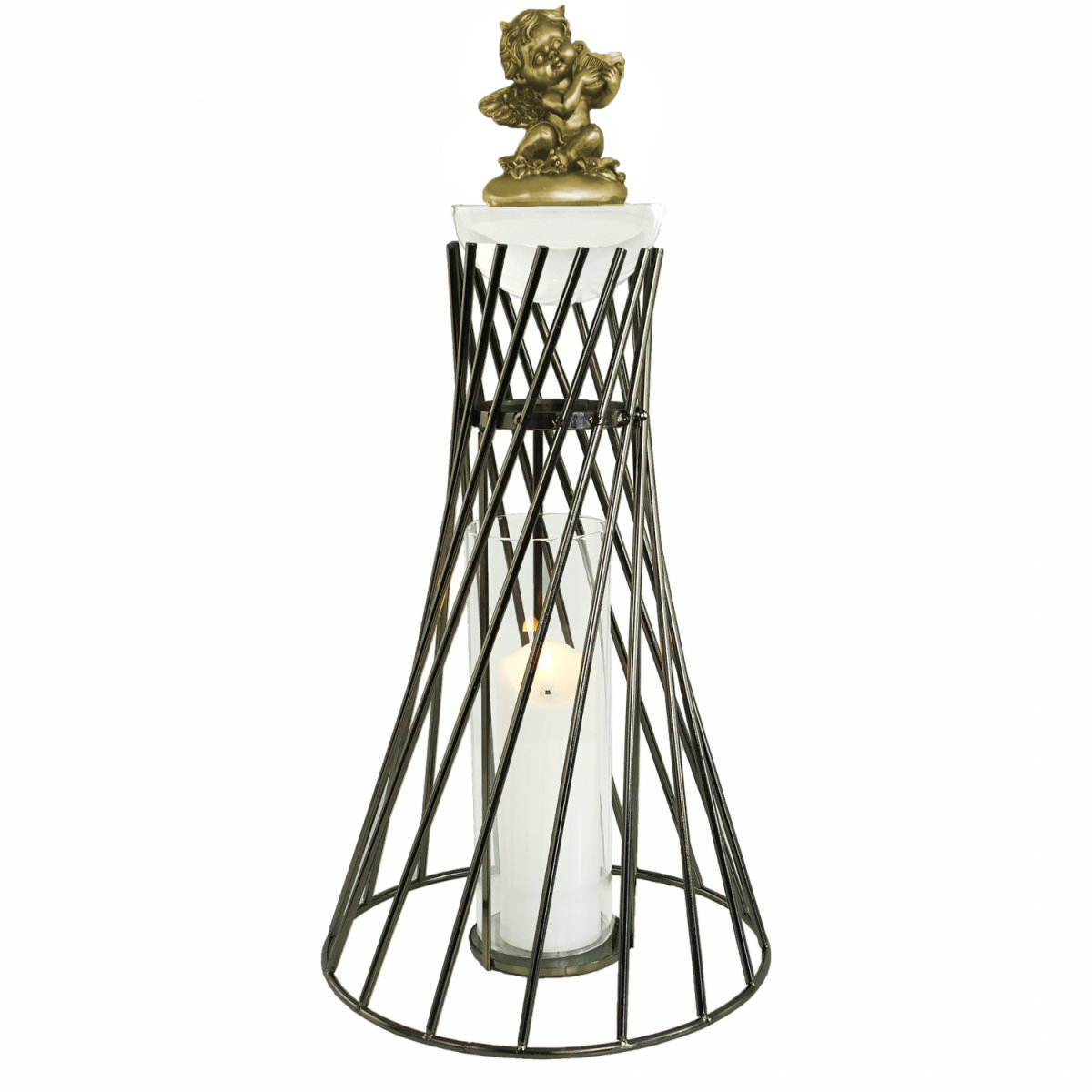 Ekskluzywny wysoki znicz o nowoczesny designie w kolorze czarnym. Wykonany ze stali nierdzewnej ze szklaną tubą, ze szklaną pokrywką i ozdobną figurką anioła.