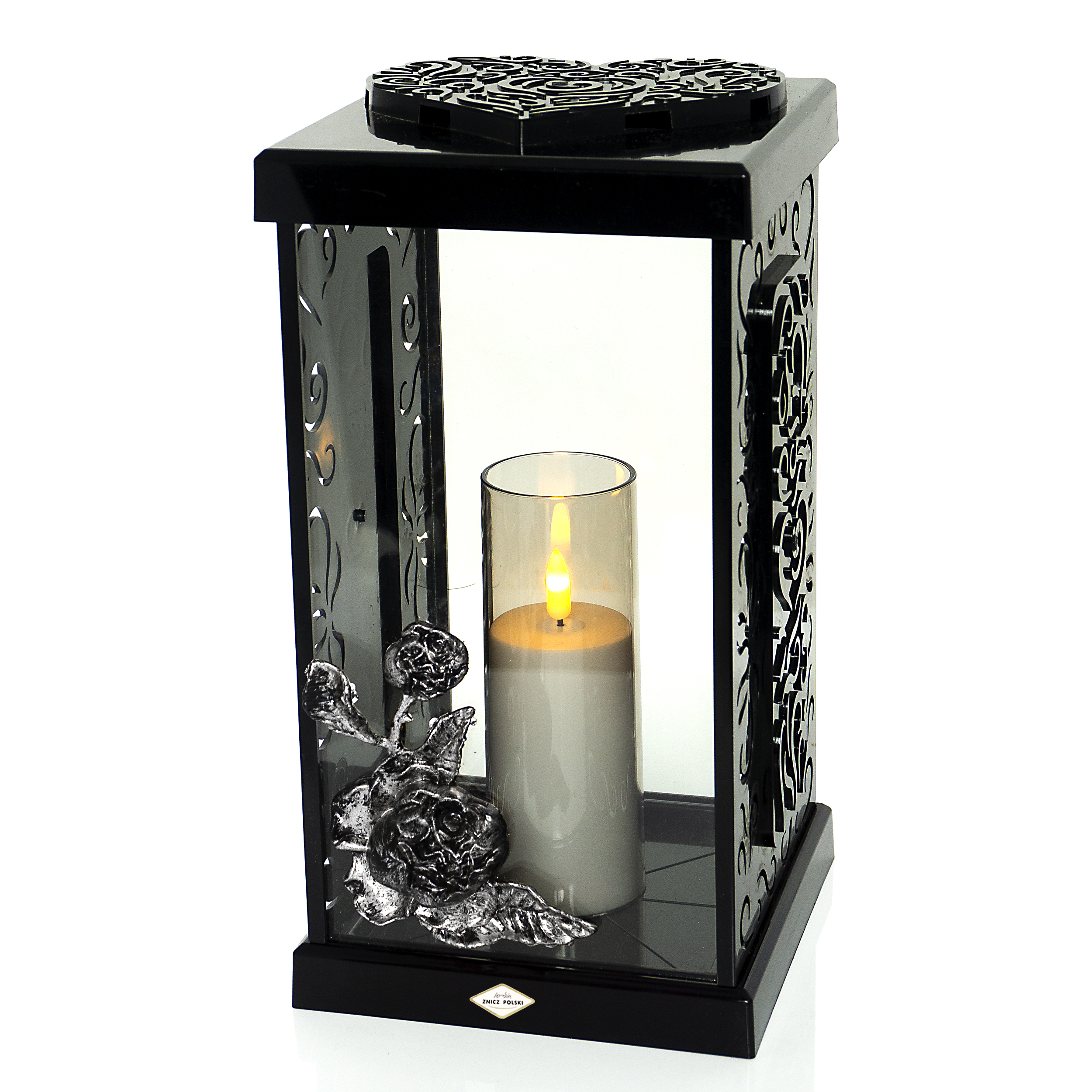 Nowoczesny elegancki znicz zdobiony ornamentami i kwiatem róży